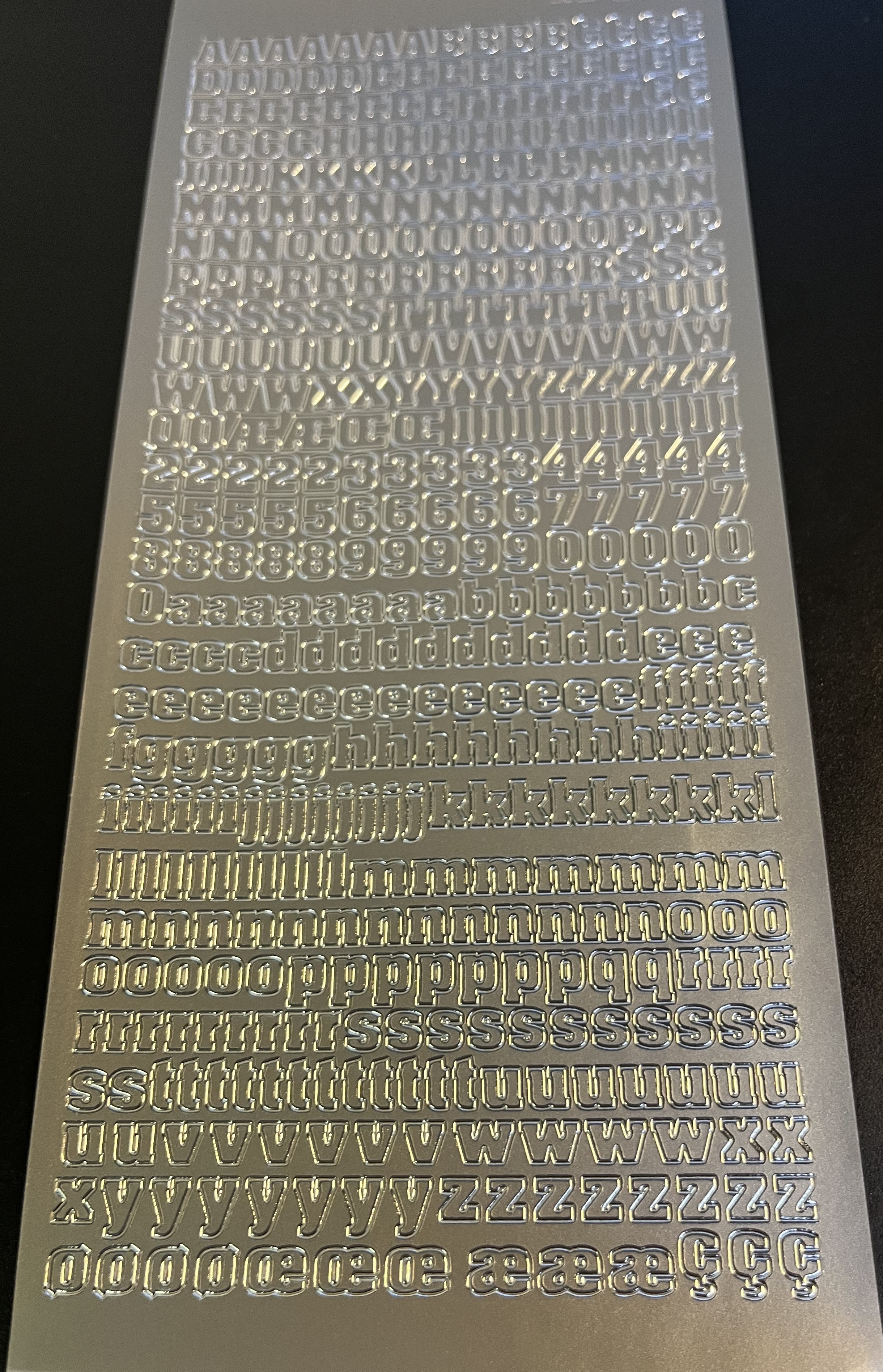 Obrysové samolepky 5ks, 10x23 cm - písmena+čísla, stříbrné